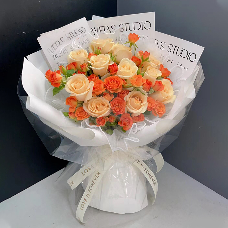 | 材料: | 11枝香槟玫瑰,11枝多头橙色泡泡玫瑰 |